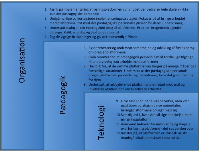 Projektets anbefalinger til skolernes arbejde med læringsplatforme er sammenfattet således: