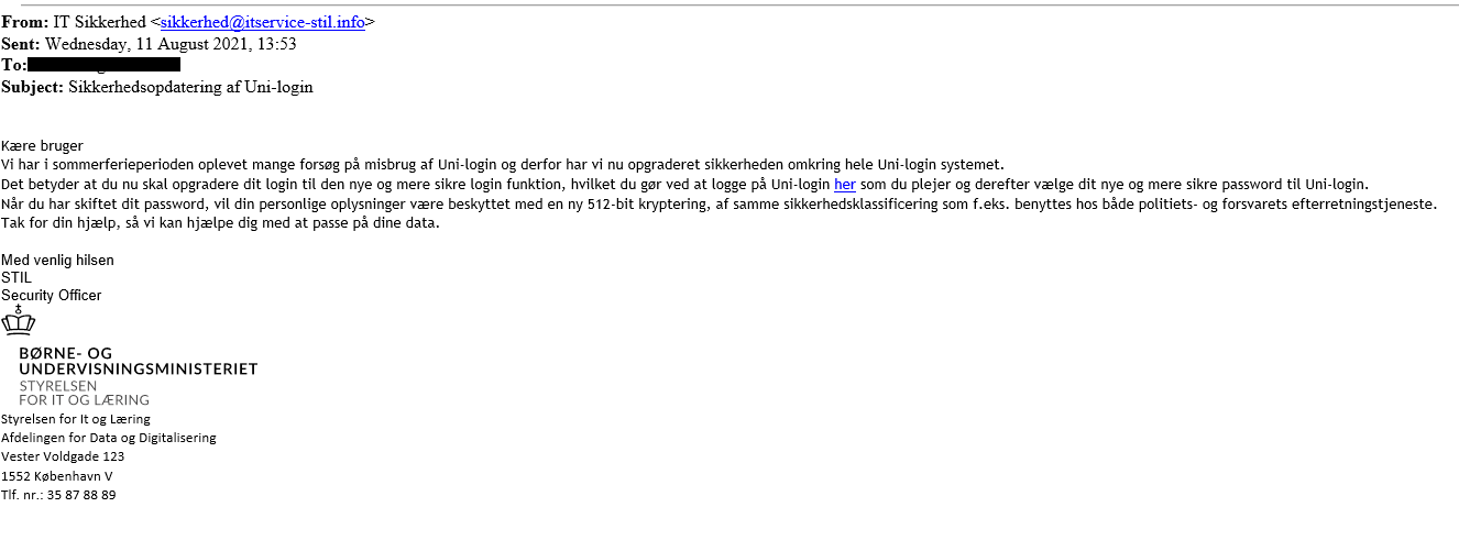 Der florerer lige nu en mail, der beder modtageren om at opgradere sit login. Mailen udgiver sig for at være fra Styrelsen for It og Læring (STIL).